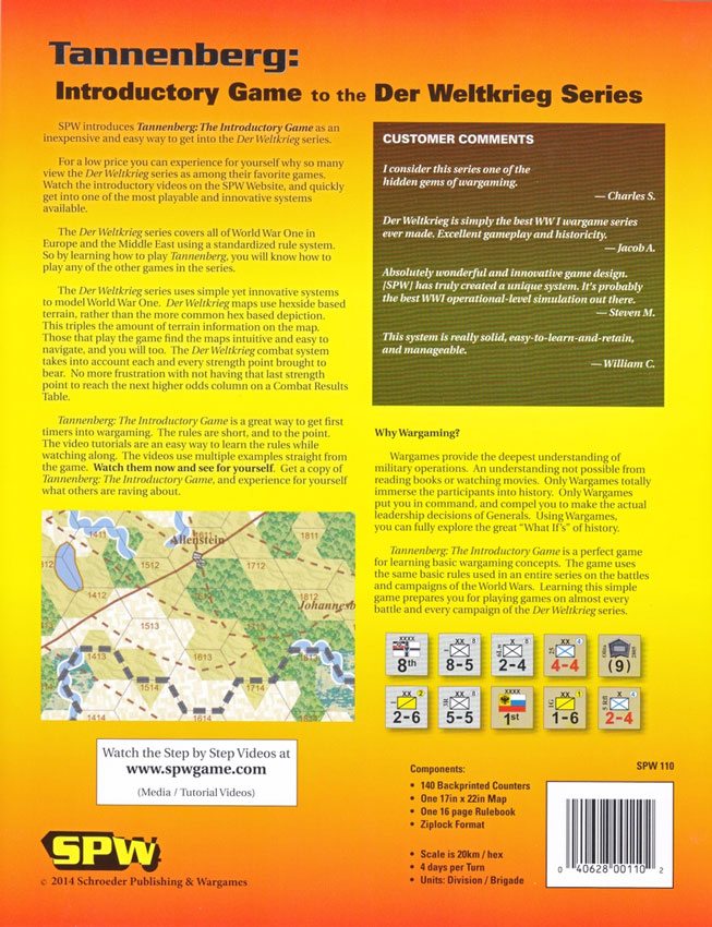 SPW introduces Tannenberg: The Introductory Game as an inexpensive and easy way to get into the Der Weltkrieg series. For a low price you can experience for yourself why so many view the Der Weltkrieg series as among their favorite games. Watch the introductory videos on the SPW Website, and quickly get into one of the most playable and innovative systems available.