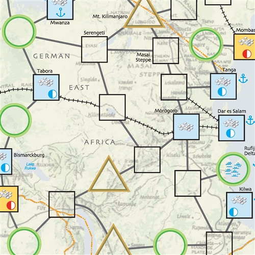 Lettow-Vorbeck is a game covering the East African campaign of 1914-18. One player controls the Allied units and tries to clear German East Africa. The other player controls the Germans and tries to prevent it, or failing that, to grab a source of supply in one of the surrounding Allied colonies. The Germans historically eked out a win by grabbing a supply source in the British colony of Northern Rhodesia even though they had been chased out of their home colony.