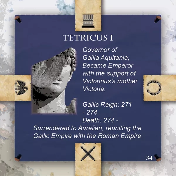 Les empereurs historiques, les co-empereurs, les prétendants et même les empereurs gaulois qui se sont séparés de Rome pendant la crise du troisième siècle sont tous représentés par des cartes individuelles dans le jeu, chacune avec des faits intéressants sur l'ascension et la chute de l'homme représenté.