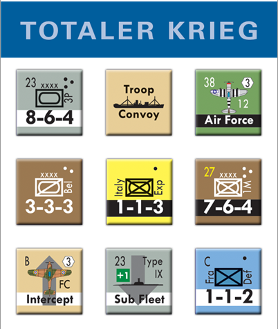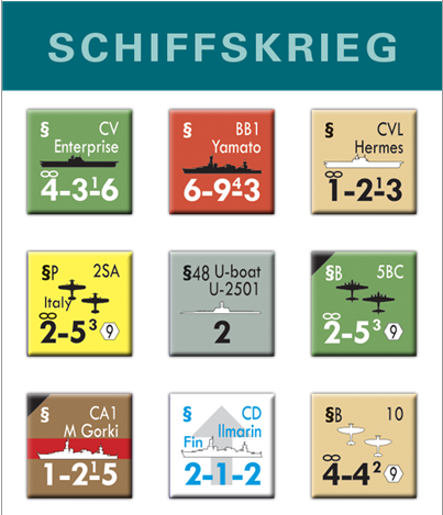 Mais ce n'est pas tout ! Cet ensemble comprend également Schiffskrieg (SK), l'extension optionnelle aérienne et navale tant attendue pour le système AE. Pour ceux qui veulent plus de détails dans la gestion des opérations aériennes et navales, SK ajoute des vaisseaux capitaux individuels (jusqu'au niveau du croiseur lourd) et des escadres aériennes pour effectuer des sorties et des combats.
