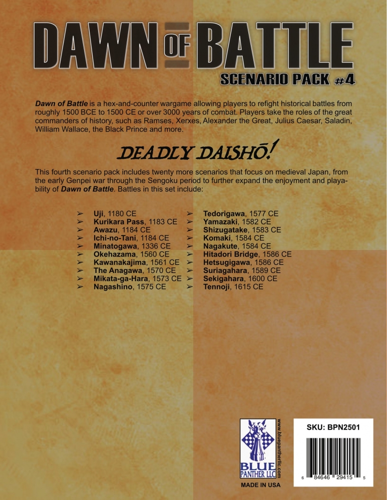 Ce quatrième pack d'extension comprend vingt nouveaux scénarios centrés sur le Japon médiéval, depuis le début de la guerre de Genpei jusqu'à la période Sengoku, afin d'accroître encore le plaisir et la jouabilité de Dawn of Battle. Les batailles incluses dans ce pack sont les suivantes
