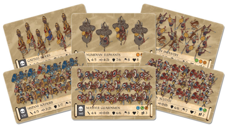 CONTENU : 2 gardes Massylii, 6 fantassins numides, 3 cavaliers Gaetuli, 2 éléphants numides, 3 guerriers Cantabri, 3 Soldurii hispani, 4 Scutati ibériques, 5 Caetatri ibériques, 2 nobles hispani, 2 pirates ciliciens, 2 frondeurs rhodiens, 2 légionnaires galates, 2 frondeurs baléares et 2 cavaliers numides.