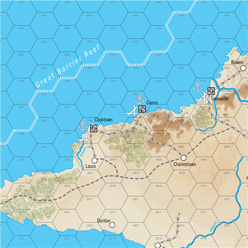 Les points logistiques (ATP) représentent la capacité de transport maritime (pour les Japonais) et les communications terrestres (pour les Alliés), compte tenu des distances entre les principales bases alliées dans le sud de l'Australie et le théâtre d'opérations actuel dans le nord de l'Australie.