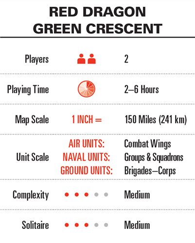 Red Dragon Green Crescent Deluxe Edition est une simulation stratégique de futurs conflits hypothétiques en Asie de l'Est, dans l'océan Indien et au Moyen-Orient. Le jeu se déroule dans un avenir relativement proche, entre 2024 et 2035. Le système de jeu est basé sur le concept éprouvé et primé, Red Dragon Rising (tiré du S&T Magazine #250) et sa suite, Red Dragon Green Crescent (tiré du Modern War #1), ainsi que sur les variantes qui ont été publiées en cours de route.