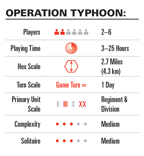 Operation Typhoon est une reconstitution opérationnelle de ce combat titanesque. Les joueurs ne s'intéresseront pas aux subtilités des combats aux niveaux inférieurs, ni aux grandes questions stratégiques des hauts-commandements respectifs. Ils seront plutôt confrontés aux problèmes d'un assaut au niveau d'un corps ou d'une armée : répartition des maigres formations blindées pour l'attaque, choix d'une ligne défensive solide, répartition du ravitaillement et affectation des unités aériennes aux missions d'appui au sol et d'interdiction. Le vainqueur sera le joueur qui aura fait preuve de la plus grande ingéniosité et du plus grand sens opérationnel.