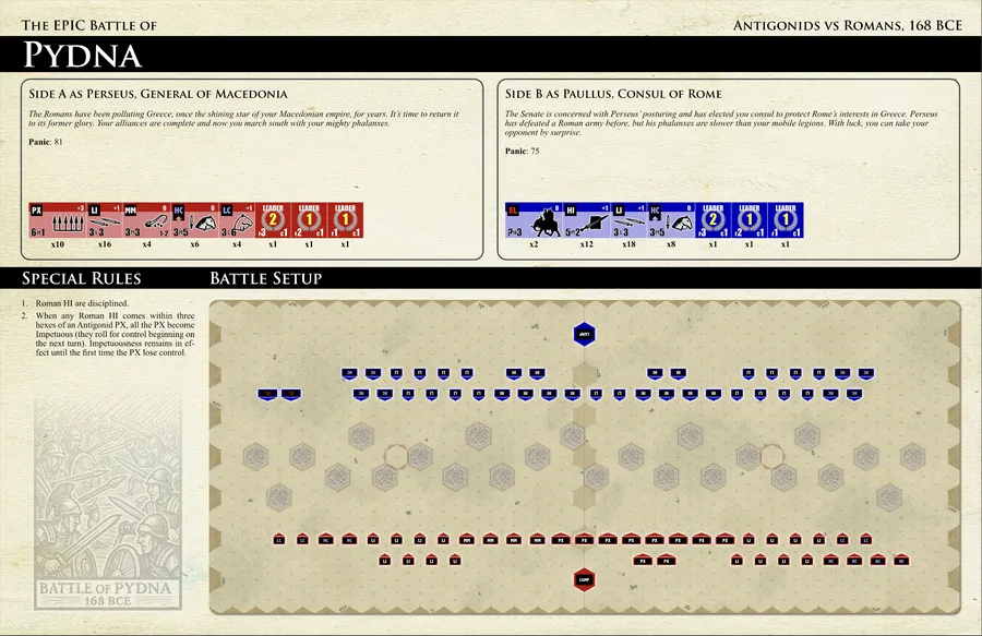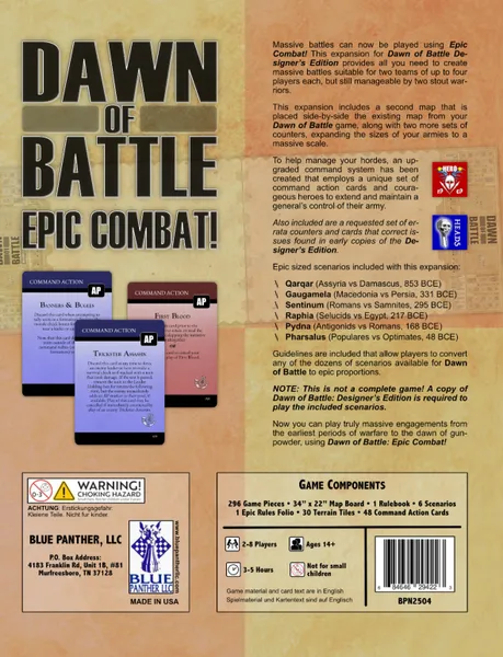Des instructions sont incluses pour permettre aux joueurs de convertir n'importe lequel des scénarios disponibles pour Dawn of Battle en scénarios épiques.
