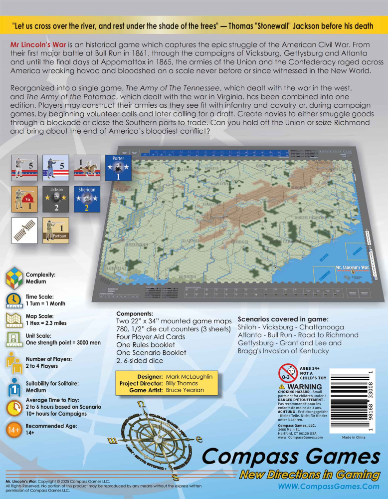 Mr. Lincoln’s War est un jeu historique qui retrace la lutte épique de la guerre de Sécession. Depuis leur première grande bataille à Bull Run en 1861, en passant par les campagnes de Vicksburg, Gettysburg et Atlanta, jusqu’aux derniers jours à Appomattox en 1865, les armées de l’Union et de la Confédération ont ravagé l’Amérique, semant le chaos et provoquant des effusions de sang d’une ampleur jamais vue auparavant ni depuis lors dans le Nouveau Monde. The Army of the Tennessee, qui traitait de la guerre dans l’Ouest, et The Army of the Potomac, qui traitait de la guerre en Virginie, ont été regroupés en une seule édition.