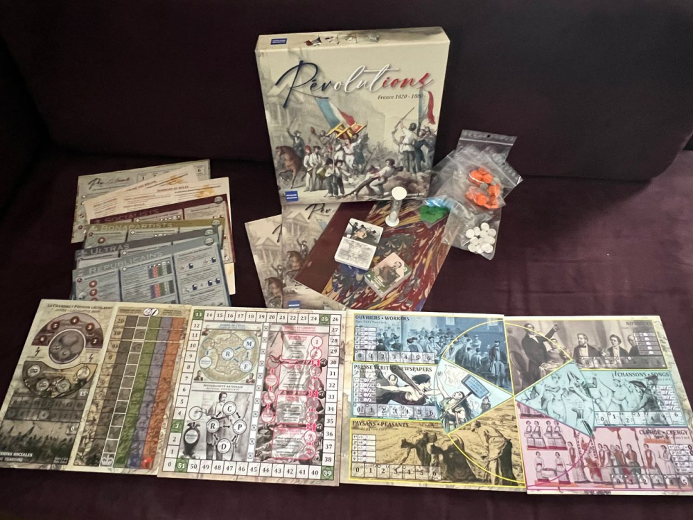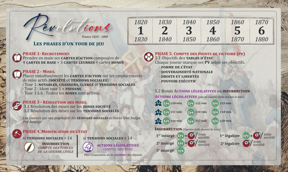 Révolutions – France 1820-1880 est une simulation politique immersive pour 3, 4 ou 5 joueurs. Préparez-vous à revivre 60 ans de conflits politiques, de guerres civiles et de grands choix de société. À la Chambre des députés ou sur les barricades, vos partisans ultras, orléanistes, bonapartistes, républicains ou socialistes s’affrontent pour faire triompher leur idéal. Chaque faction possède une situation de départ, des objectifs et des avantages distincts. Vous devrez constamment adapter votre stratégie à la situation du moment et convaincre opportunément des alliés pour imposer votre vision de la société.
