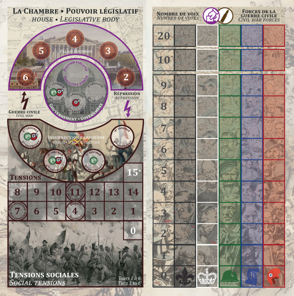 Si les tensions sociales sont trop importantes, Paris s’insurge et une guerre civile commence. Les joueurs mobilisent alors les zones société pour soutenir le gouvernement ou alimenter l’insurrection. Si la révolution triomphe, les insurgés victorieux peuvent modifier plus radicalement l’État.