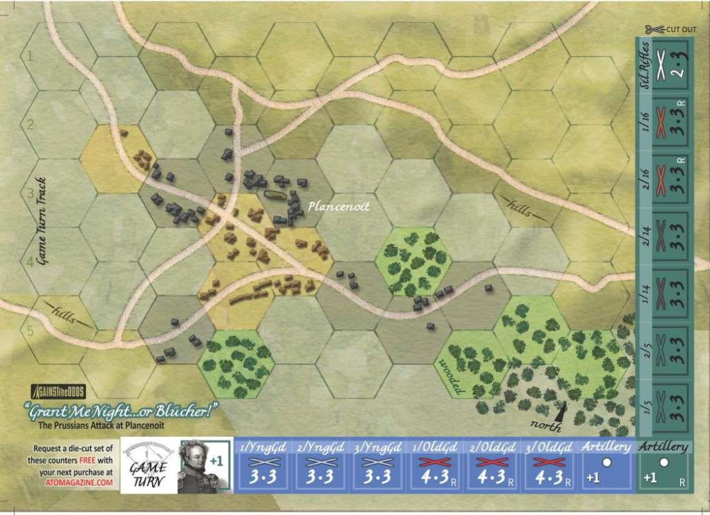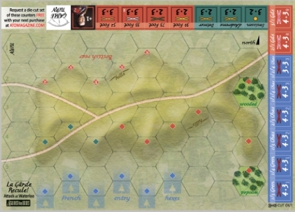 "Grant Me Night...or Blücher!" (« Donne-moi la nuit… ou Blücher ! ») – Alors que la ligne de Wellington à Waterloo subit la pression et commence à céder, sa prière est exaucée. Ce n’est pas la tombée de la nuit, mais les forces prussiennes sous les ordres du F.M. Blücher qui arrivent derrière le flanc droit français à Plancenoit et attaquent impulsivement ! Napoléon est contraint d’engager un autre de ses corps d’armée ainsi que la Jeune Garde pour les repousser.
