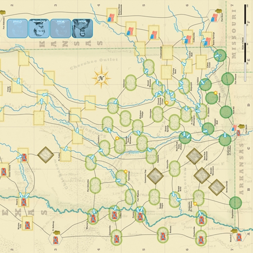 Warpath covers the campaign for control of Indian Territory during the American Civil War. The map covers all of the ostensibly neutral Indian Territory, plus part of the neighboring Union and Confederate states. The playing area has spaces in lieu of hexes; each space is classified according to its dominant terrain which affects movement, combat, and supply. Some of the 204 counters represent the infantry and cavalry regiments and artillery batteries used by each player to create forces on the map. Each turn represents six months of real time.