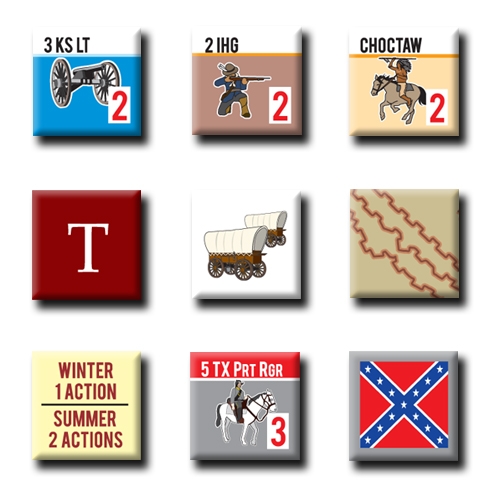 The action is driven by players alternately drawing campaign markers. Most markers enable the drawing player to conduct one or more operations, one operation being (1) moving and fighting with one force, (2) recruiting a unit, or (3) building a fort. Other markers allow the drawing player to control the "wild" Kiowa and Comanche Indians raiding from the west; they represent a danger to both sides and control switches back and forth as the control markers are drawn. The length of a turn is variable and unknown to either player; it ends after two "End" markers have been drawn fromt he campaign marker pool.