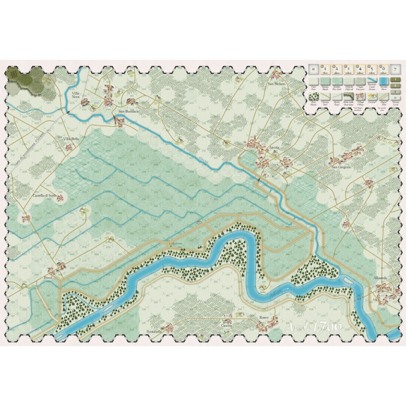 Arcole 1796 is a highly unusual game in the Jours de Gloire series, due to the nature of its terrain. In an environment of marshes and rice fields, numerous dikes had been constructed. Their initial purpose was to protect the region from flooding by the Adige and Alpone Rivers, but they also came to be used as a means of travel. The main fighting during the three days of the Battle of Arcola occurred on these dikes, which compartmentalized the terrain, and thus the opposing columns of troops met head-to-head.