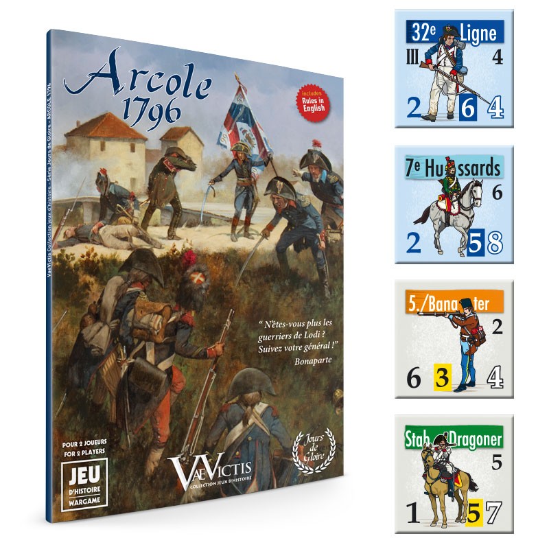 Arcola 1796 is the 41st battle in the Jours de Gloire series. The battle was fought during three days, from November 15-17, 1796, and is simulated in three independent scenarios and a campaign game, taking into account the strategic situation in which the fighting occurred.
