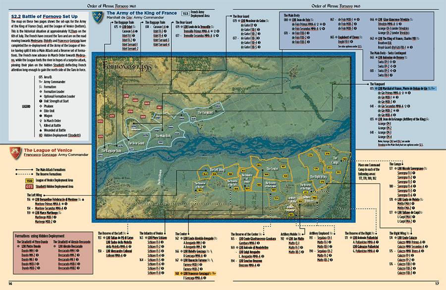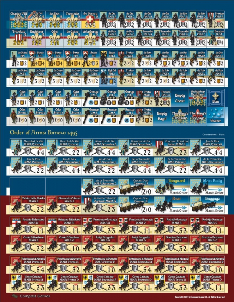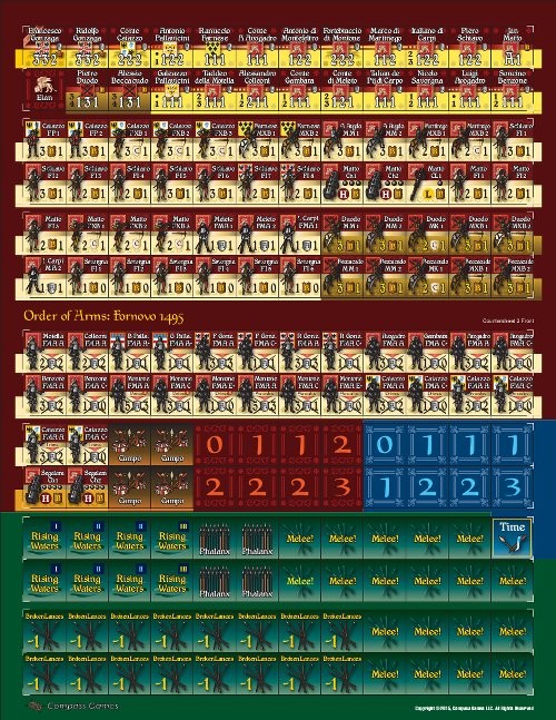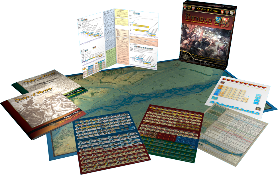 Fornovo 1495, the first game in the series presents the battle fought between the French Army of King Charles VIII, and the Condottieri forces of the League of Venice under the command of Francesco II Gonzaga of Mantua. The game features the Historical Battle as fought by Francesco Gonzaga across a rising Taro River, a free-set up version, and a what-if scenario that portrays the Italian fear of a French drive on Parma.