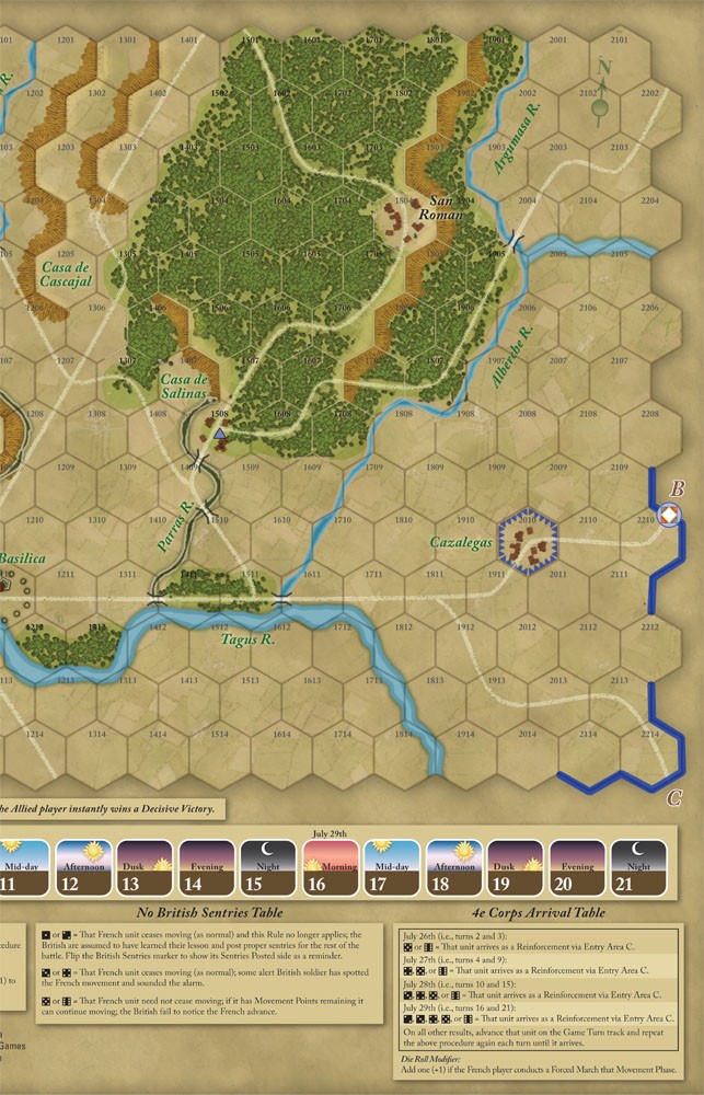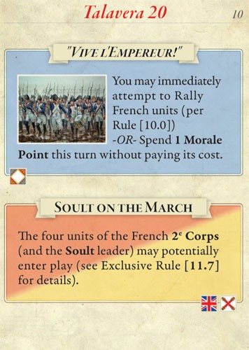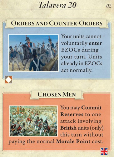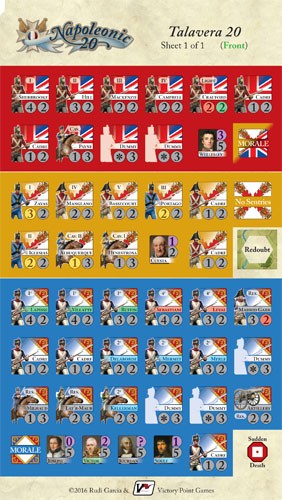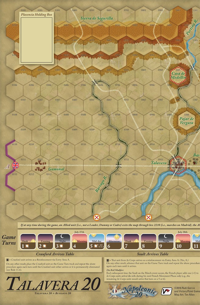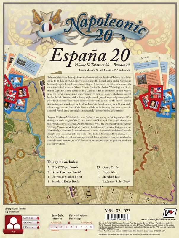 Rudi Garcia's Talavera 20 recreates the major battle which occurred near the city of Talavera de la Reina on 27 to 28 July 1809. One player commands the French army under Napoleon's brother, Joseph, the self-proclaimed King of Spain, and the other commands the combined allied armies of Great Britain (under Sir Arthur Wellesley) and Spain (under Captain-General Gregorio de la Cuesta). After his attempt to liberate Madrid from the French was repulsed, Cuesta's army fell back to Talavera, which was covered by the British. Starting with a daring night attack, Joseph repeatedly attempted to push the allies out of their superb defensive positions, to no avail. As the French, can you find and exploit a weak spot in the allied lines? As the allies, can you hold your shaky alliance together and fend off the French (all the while keeping a nervous eye out for a second French army that might unexpectedly show up behind your armies)?