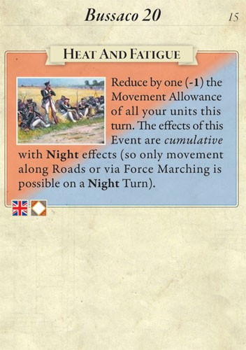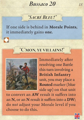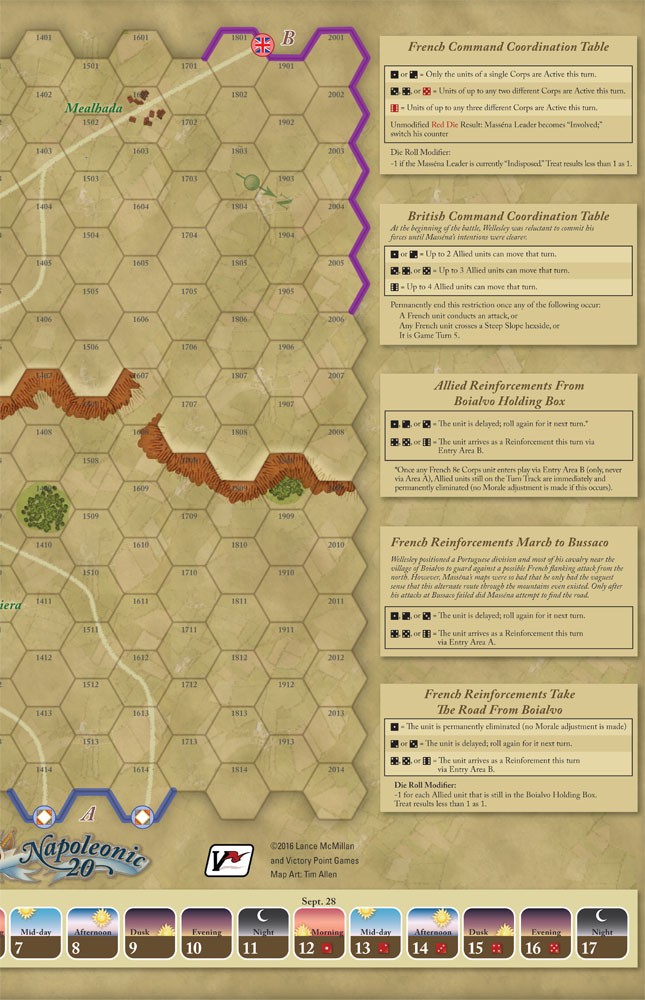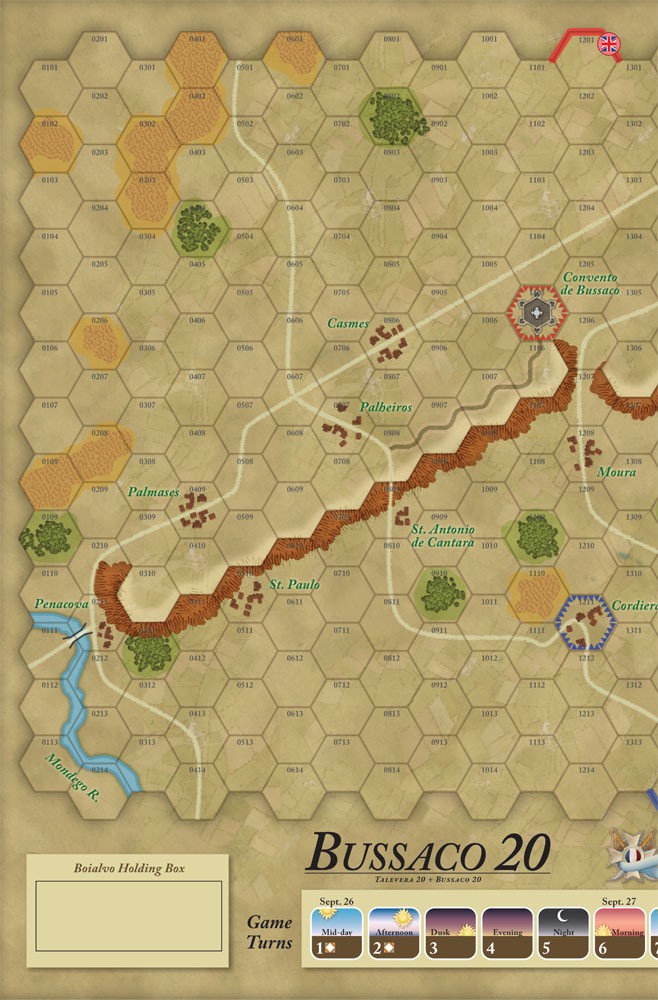 Bussaco 20: Second Edition, from designer Lance McMillan, features the battle occurring on 26 September 1810, during the early stages of the French invasion of Portugal. One player commands the French army of Marshal André Masséna, while the other controls Sir Arthur Wellesley, Viscount of Wellington's combined British and reconstituted Portuguese army. Historically, a distracted Masséna launched a series of uncoordinated frontal assaults straight up a steep ridge into the teeth of the British defenses, suffering heavy losses before Wellington elected to disengage and fall back to Lisbon. Can you as Masséna avoid the same mistakes, or as Wellington can you use your superior position to achieve a decisive victory?