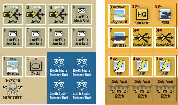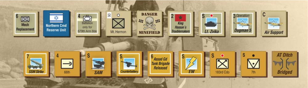 The Israelis start with few units but gain strength as reinforcements arrive, but will there be enough and will they get there in time? The Syrian player starts with a very strong force, but must attack at the right places and rely on rapid breakthrough across the Golan Heights in order to seize the objectives. Time is against the Syrians, with not only the Israeli reserves arriving, but also as the SAM barrier gets reduced and the effectiveness of the Israeli Air Force grows. The Syrians must strike hard and fast, then fight to hold on to their gains.
