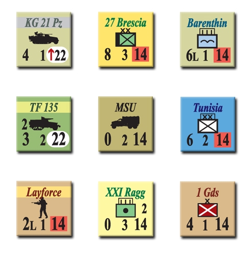 Desert Fox Deluxe is a combination of two previously published games covering parts of the North African campaign–Desert Fox and Trail of the Fox–expanded with additional rules, units, and maps to cover the entire war in the North African desert from the Italian invasion of Egypt in 1940 to the final Allied clearance of Africa in 1943. The map scale is 10 miles perhix, turns cover one month each, while units are mostly regiments and brigades, with specialist battalions and a few Italian and Vichy French divisions. The turn sequence is built around a pair of move-fight impulses for each player, with separate phases for events altering the situation (like the frequent Commonwealth campaigns elsewhere in the Middle East), application of air and naval power, and initiative determination. Logistics is the paramount consideration given the vast distances. Fast and furious action alternates with quiet periods as both sides strive to build up forces and supplies.