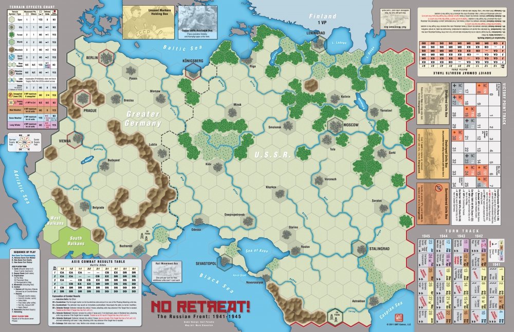 No Retreat: The Russian Front is a new deluxe edition of designer Carl Paradis' two-player wargame that retells the story of the titanic struggle between the invading armies of Nazi Germany versus Communist Russia during WW2 at a player-friendly and manageable level of scope and difficulty. This edition combines both the original game and its two extensions (Na Berlin ! and No Surrender!) using deluxe components of “Twillight Struggle Deluxe Edition” quality. With only 50 Army/Front sized counters for the Tournament game, and 70 for the whole campaign, and with very low stacking, it’s a quick-playing yet realistic affair that favours the strategic and offensive-minded player.