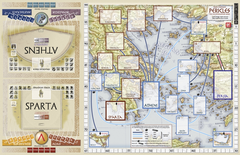 Pericles is a ‘sandbox’ (unscripted) wargame that covers the ENTIRE period of conflict described in Thucydides classic history on the Peloponnesian wars. Pericles is a four-player game, where two teams of Athenian and Spartan factions fight for Hegemony in 5th Century Greece. Each team of two represents a faction vying for control of their City States, strategy, and honor. Athens sees the Aristocrats debate issues with their opposing Demagogues, while in Sparta House Agiad and House Eurypontid contend for royal dominance.