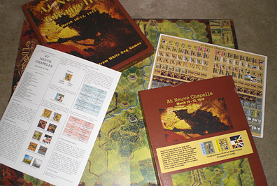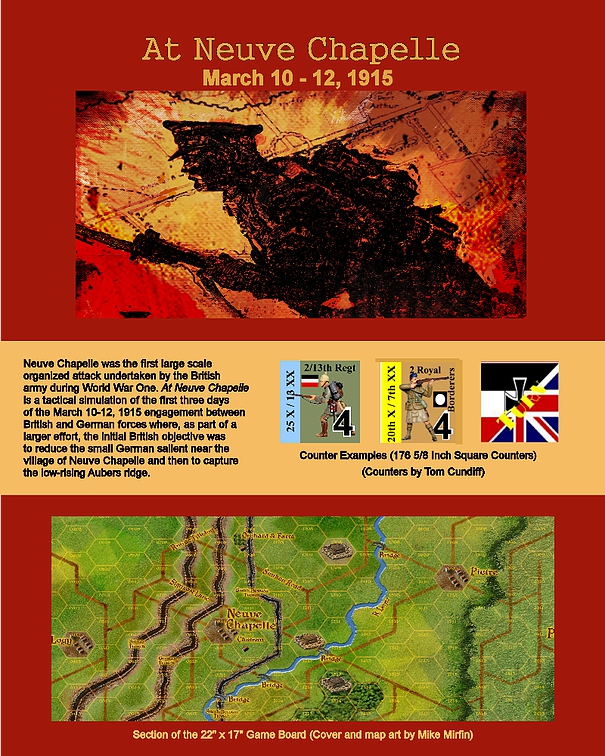 At Neuve Chapelle provides a tactical simulation of the World War I battle. The British attempted to reduce a poorly-defended German salient centered on the town of Neuve Chapelle. Plans were to expand a breakthrough and with cavalry and infantry reserves take the Aubers ridge line. However, poor communication and coordination and the weather conspired to slow the initial British successes and allowed the German army to rush reinforcements into the area. Among other game features, At Neuve Chapelle uses offensive artillery and defensive artillery fire, British command checks, and a unique assault combat mechanic to simulate the bloody struggle.
