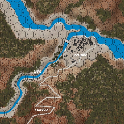 Combat Veteran is a simple two-player tactical combat system that simulates the dynamics of infantry combat at the individual (man-to-man) level. This game features two particular historic scenarios as the introduction to the wider system: Firefight at the Rice Paddy Angle (Vietnam in Mekong region, 1967), and Firefight at Combat Outpost Keating (Afghanistan in the Nuristan Province, 2009). Both firefights involved about a platoon of US infantry against a numerically superior enemy force. The US and Viet Cong game soldier game pieces represent specific, individual men of their respective units, whereas Taliban soldier game pieces represent three to six men. Each hex represents about 40 meters of actual terrain (almost half a football field from hex corner to hex corner), and the entire map area is roughly the same acreage as Hyde Park in London. Each weapon game piece represents one specific type of named weapon and its standard loadout. For example, the M60 weapon game piece represents one M60 machinegun, at least a 150 rounds of ammunition, and presumably a spare barrel (and even an asbestos glove), etc.