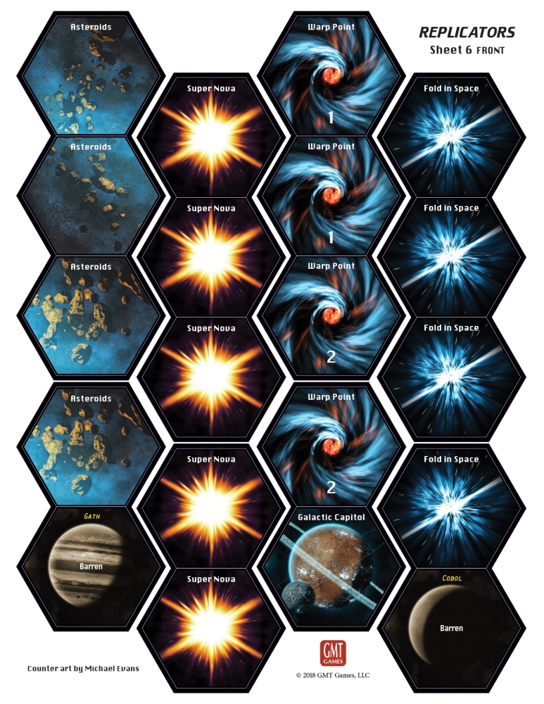 Terrain Tiles: Hex sized terrain tiles have been added for planets, asteroids, nebulae, and other permanent terrain effects. Six whole sheets and 120 tiles! When an exploration marker reveals a terrain effect that stays on the map, the exploration marker is removed and replaced by a tile. This gives the map a nice visual effect. It also creates more room in the hexes by removing the exploration marker. The entire hex is the terrain.