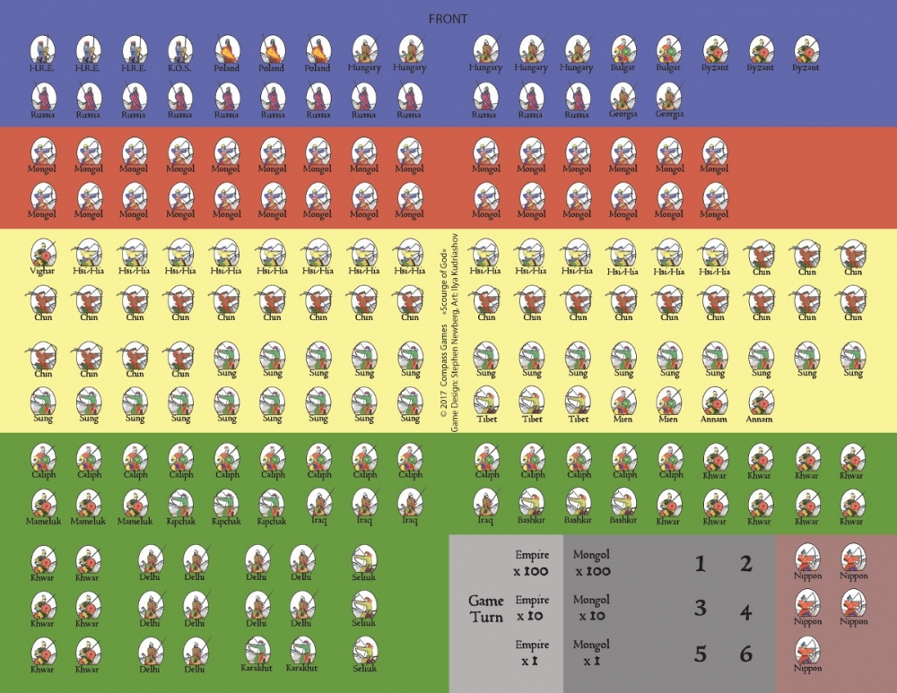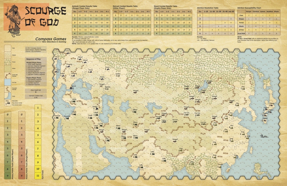 A mainly solo player depiction of the result of the consolidation of the Mongol tribes by Genghis Khan and the resulting 50 years of conquests that created an empire of the Steppes and brought Mongol horsemen across China to the East and into Poland to the West. The Mongol player is the active player, with the Empires player almost entirely reactive. The Mongol player must balance make his conquests in a race against the clock and scarce resources.
