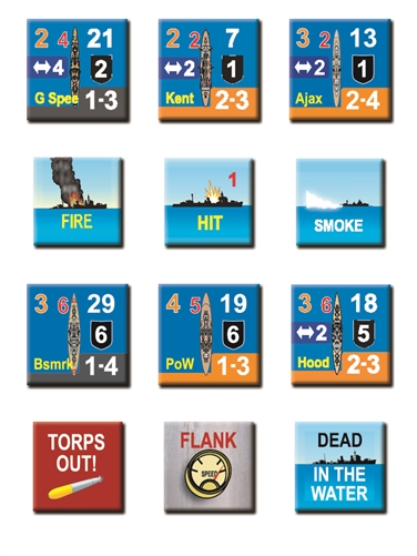 Each counter depicts a single ship or the information markers required to denote a ship’s damage, special ship movement, or configuration. Ships are rated for weight of fire, range, structural integrity, maneuver, speed, and special capabilities.