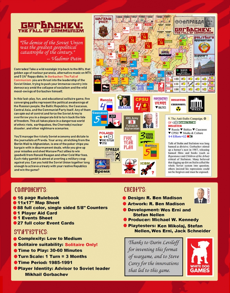Gorbachev: The Fall of Communism is a solitaire strategy game covering the collapse of the Soviet Union (1985-91), designed by R. Ben Madison.