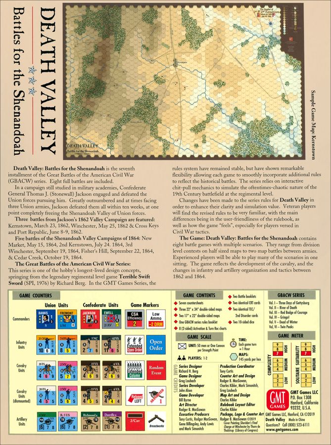 Death Valley: Battles for the Shenandoah is the seventh installment of the Great Battles of the American Civil War (GBACW) series, published by GMT Games. Eight full battles are included.