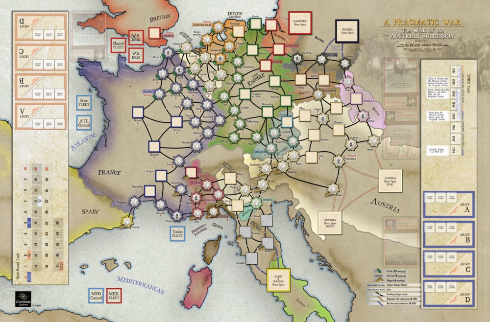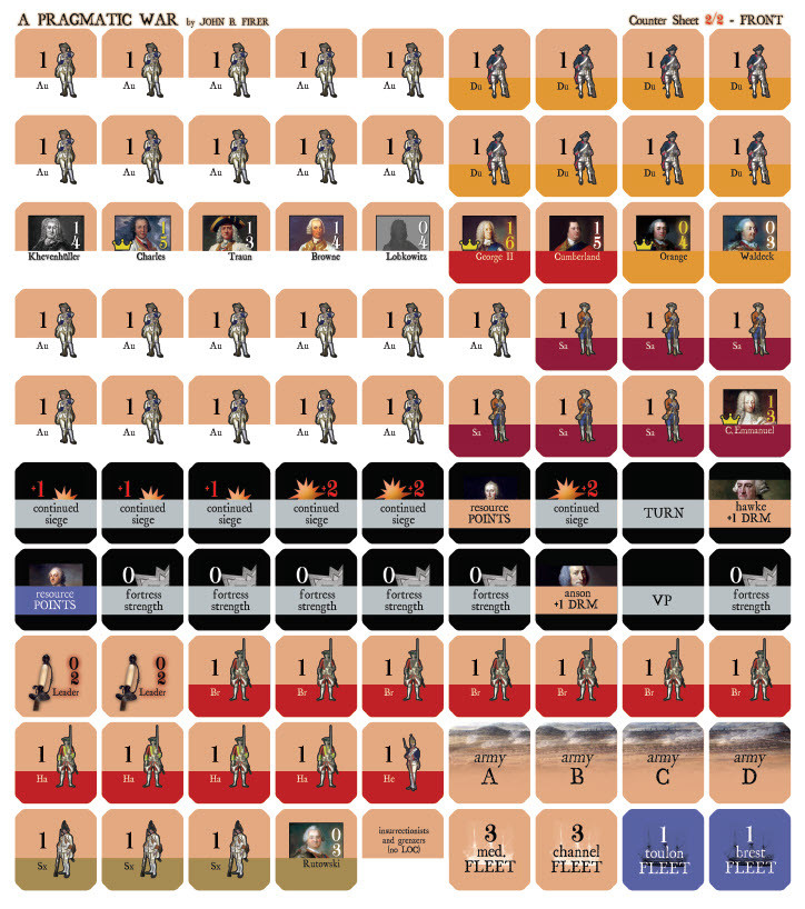 A Pragmatic War: The War of the Austrian Succession 1741 – 1748 is a two-player game simulating the War of the Austrian Succession. One player represents the Austrian interest represented by the Austrians and those powers in Europe faithful to the original agreement, (“the Pragmatic Alliance”). The other player represents the challengers to the Austrians, the Bavarian rival for the Imperial title, Charles Albert and his supporters, primarily the Bourbon rulers of France and Spain intermittently joined by Prussia (“the Bourbons”). The war like its predecessor, the War of the Spanish Succession was fought primarily to determine who would succeed to the throne of a great empire, in this case the Austrian Empire. When the current ruler of the Austrian crown lands and Emperor of the Holy Roman Empire, Charles VI died without male issue he had laid the groundwork for his eldest daughter Maria Theresa to succeed to the Hapsburg crown lands. Known as the “Pragmatic Sanction”, this diplomatic effort obtained the agreement of the leading powers of Europe to her accession to the Hapsburg dominions and the election of her paramour as the next Holy Roman Emperor. However, with the opportunistic seizure of Silesia by the young Frederick the Great of Prussia, the agreement unraveled and the war began. In time, it would involve virtually all of Europe.