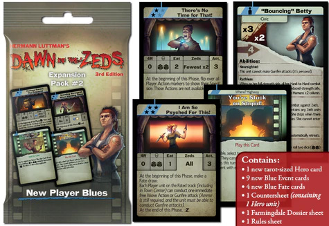 The second Dawn of the Zeds: Third Edition Expansion Pack features ??13 new Outbreak! (blue) Level Event and Fate cards, ?broadening the narrative and gameplay excitement. Zeds are learning to move in new and unexpected ways, catching the citizens of Farmingdale unaware and, at times, unprepared. Panic, confusion, and arguments only help the Zeds' cause, so it is important that citizens stick together during these dark times.