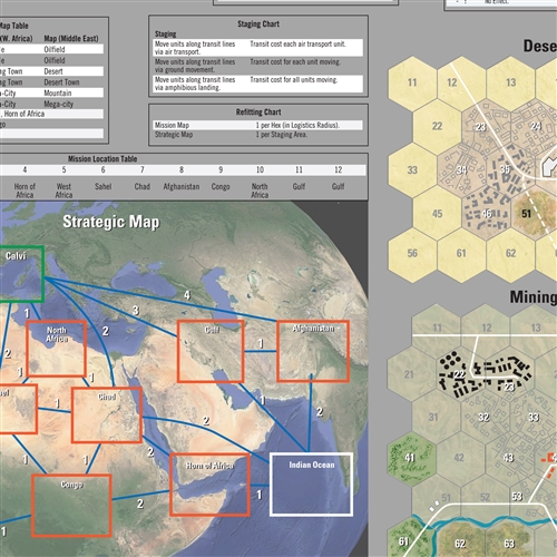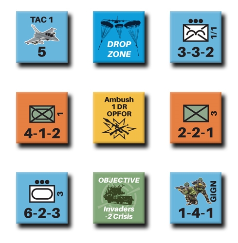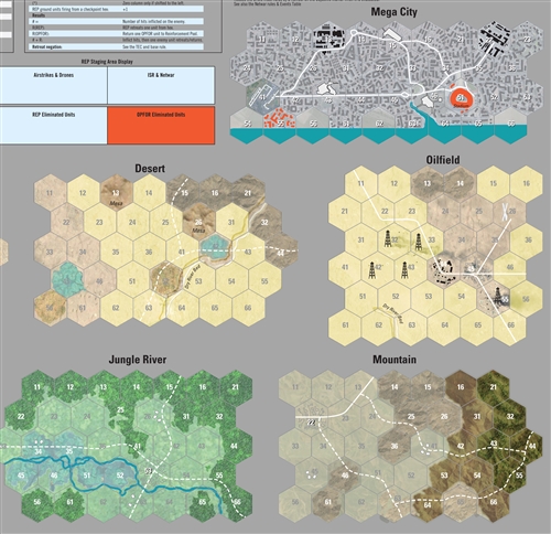 Foreign Legion Paratrooper is a solitaire wargame. The player controls the French forces. The game system controls various Opposition Forces (OPFOR). The game is played in missions (or scenarios). You can link the various missions into a larger campaign game. It is recommended that you first play a couple of games before playing a campaign game. While the game is designed as a solitaire game and requires only one player to play. The game can also be played by two or more players, each controlling different parts of the REP. Each turn equals anywhere from 12 hours to one week. Hexes on the Mission Map are anywhere from 0.5 to 5 kilometers across. A platoon is 30-60 soldiers. OPFOR units represent anywhere from 10 to 1,000 fighters.