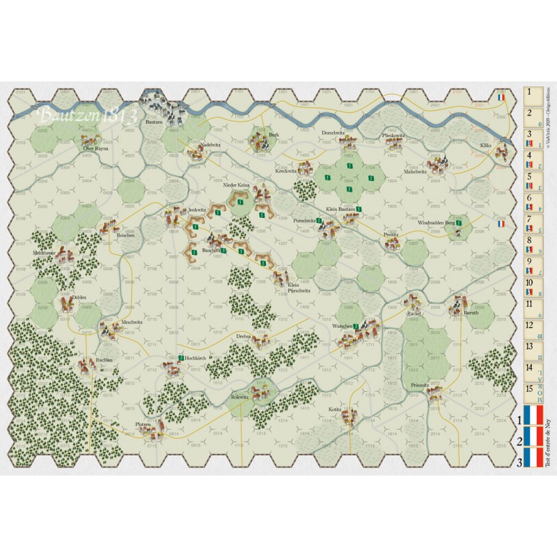 Bautzen is a game for two players that simulates the second battle day of Bautzen, the second main battle of the spring 1813 Napoleonic campaign. The 21st of May, The Emperor Napoleon assaulted the fortified positions of the Russo-Prussian army of Wittgenstein and Blücher. The total victory the Emperor needed depended on Marshall Ney, who however did not completely fulfilled his enveloping manoeuver.