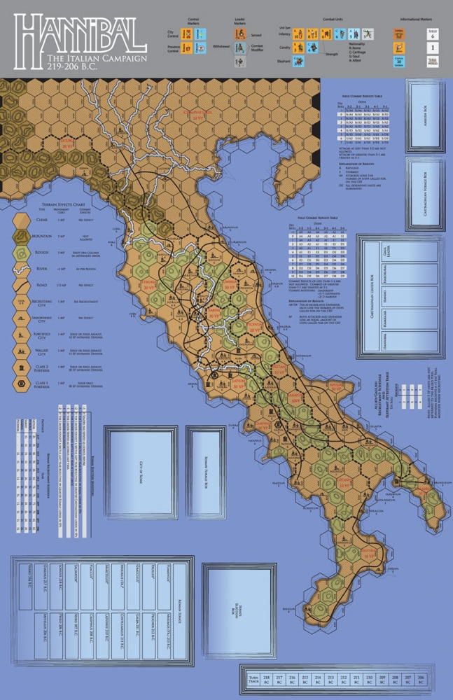 IN 218 BC the great Carthaginian general Hannibal crossed the Alps with the avowed intention of bringing Rome to her knees. Gathering allies in Northern Italy, he out maneuvered, ambushed, and out fought the Roman armies sent to defeat him. Moving south, he inflicted upon Rome her greatest defeat at Cannae in 216 BC. Roman resolve wavered but never crumbled as she witnessed her armies defeated with apparent ease. Time and again Rome was forced to regroup to meet the challenge. But she always did. For 13 years this continued. With little support from Carthage and relying mainly on disaffected Roman allies, Hannibal wreaked havoc in Italy. Yet, in the end, Rome remained unconquered. HANNIBAL is a medium complexity strategic study of the Second Punic War. Turns represent a year of campaigning with map hexes scaled to 40 kilometers. The game included 200 counters, one full size map, and the rules booklet.