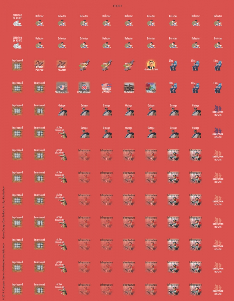 No Motherland Without: North Korea in Crisis and Cold War is a card-driven strategy game for two players. The game depicts the struggles of the Kim Regime against the West from 1953 to present day North Korea. In the aftermath of the Korean Armistice Agreement, the Korean peninsula divided in two. While its signature marked a cessation of armed conflict, the war was not over. In over six decades since the armistice was signed, three generations of the Kim regime resisted Chinese and Soviet control, endured famine, floods, isolation, and economic sanctions while defiantly pursuing nuclear weapons.