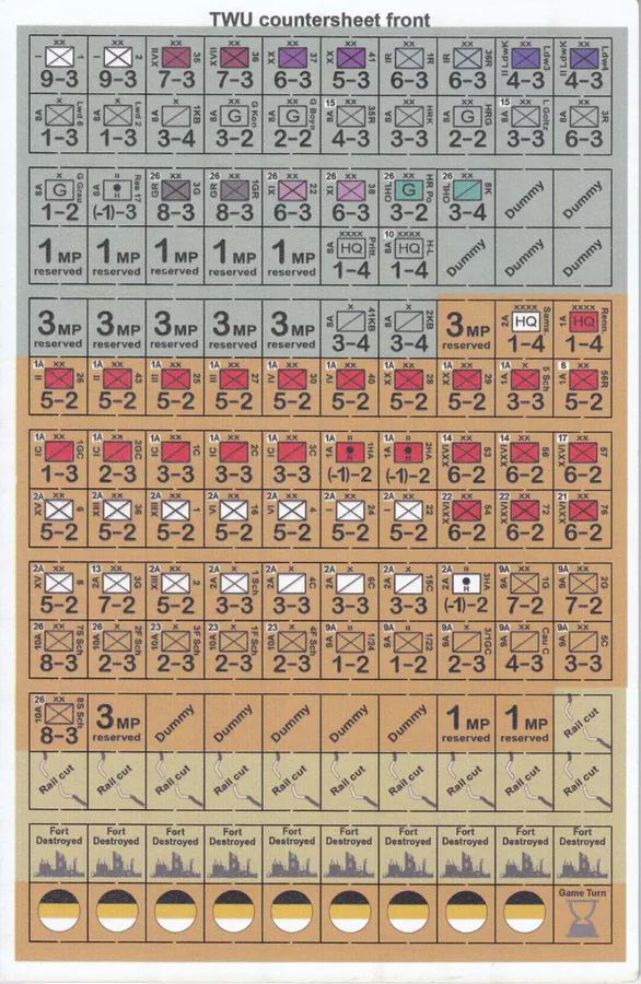 THE WORLD UNDONE (TWU) is a new operational, division level WW 1 system inspired by the brilliant late John Young’s The Marne. What results is an extremely simple, nuanced, and quick playing, immersive simulation of the first big German victories of WW1. Play is broken down into a simple Move-Combat-Move-Combat phase for each side, with units participating in the first combat phase unable to move or fight during the second. The game covers August 13 to September 13th covering both the battles of Tannenberg and the Masurian Lakes. Separate CRTs are used for German and Russian forces to reflect differences in quality and doctrine. This is an extremely low complexity game that I hope will be able to draw new players into wargaming, and remind old players why they started gaming in the first place. The World Undone will be a 3 part series covering East Prussia, Galicia and the Western Front (maybe Serbia/Austria too).