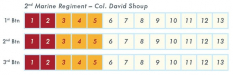 The cohesion track for each battalion will have a marker on it that is moved up and down based on activations, combat, and regrouping. Once a battalions cohesion gets too low (below 6) an exhaustion check is made that could put the battalion out of action until it recovers some cohesion. The battalion track above is for the 1st, 2nd, and 3rd battalion of the 2nd Marine Regiment led by Col. David Shoup.
