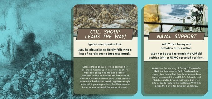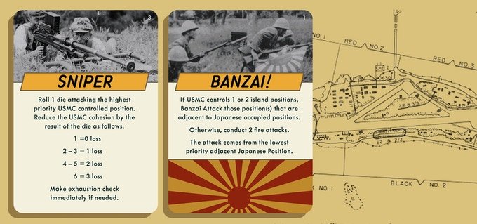 The USMC cards add to the USMC players options, some add dice as support to attacks, some allow the adjustment of a die face, some allow multiple battalions to activate, however "bad intelligence" will slow your drive and allow the Japaneses AI a double activation.