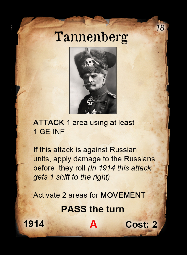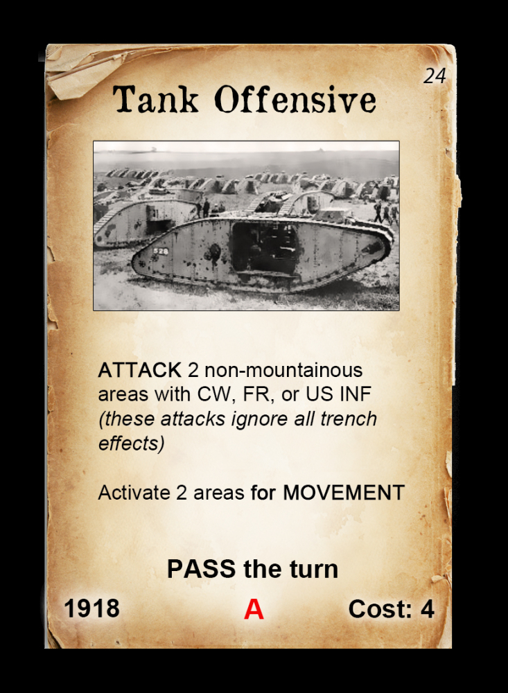 The core of the game is the unique card re-buy system, in which players take their annual production (adjusted for U-boats, blockades, and Zeppelin bombing) and decide which cards they need for the upcoming year. Cards not only provide for reinforcements, but allow for movement, combat, and entrenchment. Which cards to rebuy is without question one of the key decisions the player must make to prepare for next year’s operations.