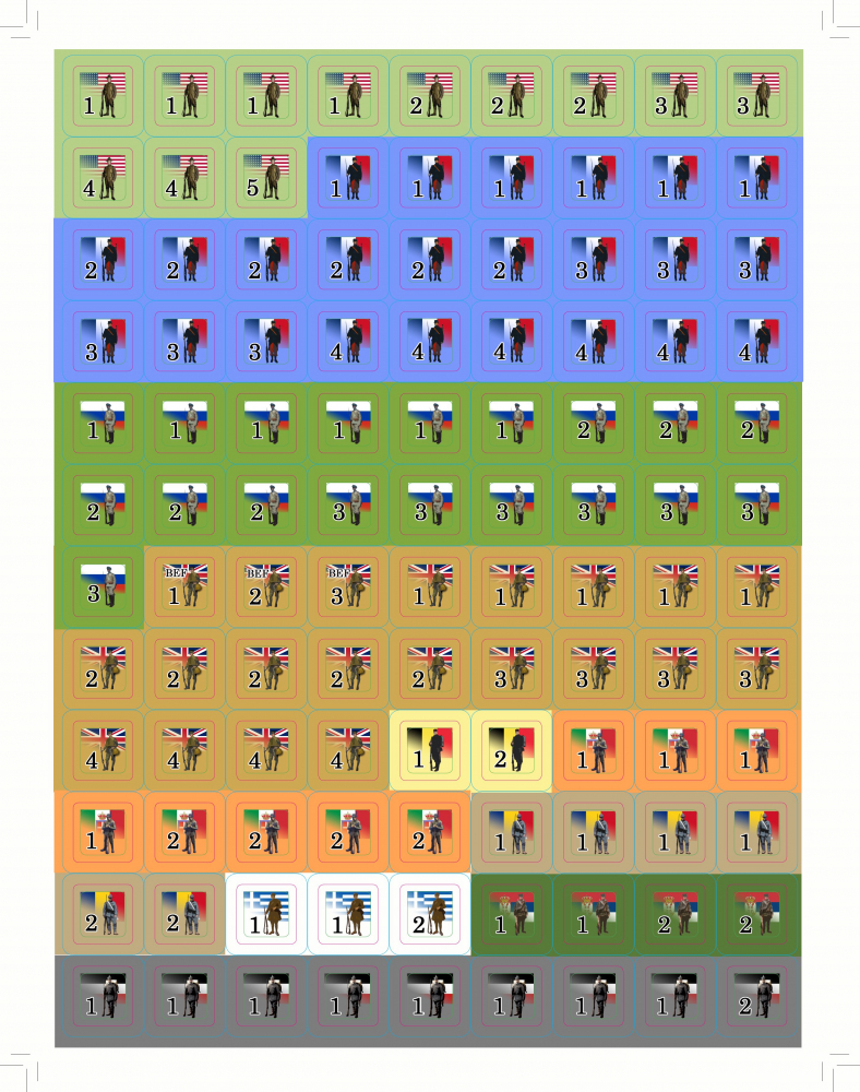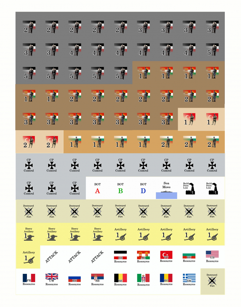 The game has infantry units for all of the major participants, and artillery “units” actually represent stockpiles of ammunition to be used for offensives. Naval operations are mainly abstracted, although sea movement to Salonika and Gallipoli is allowed.