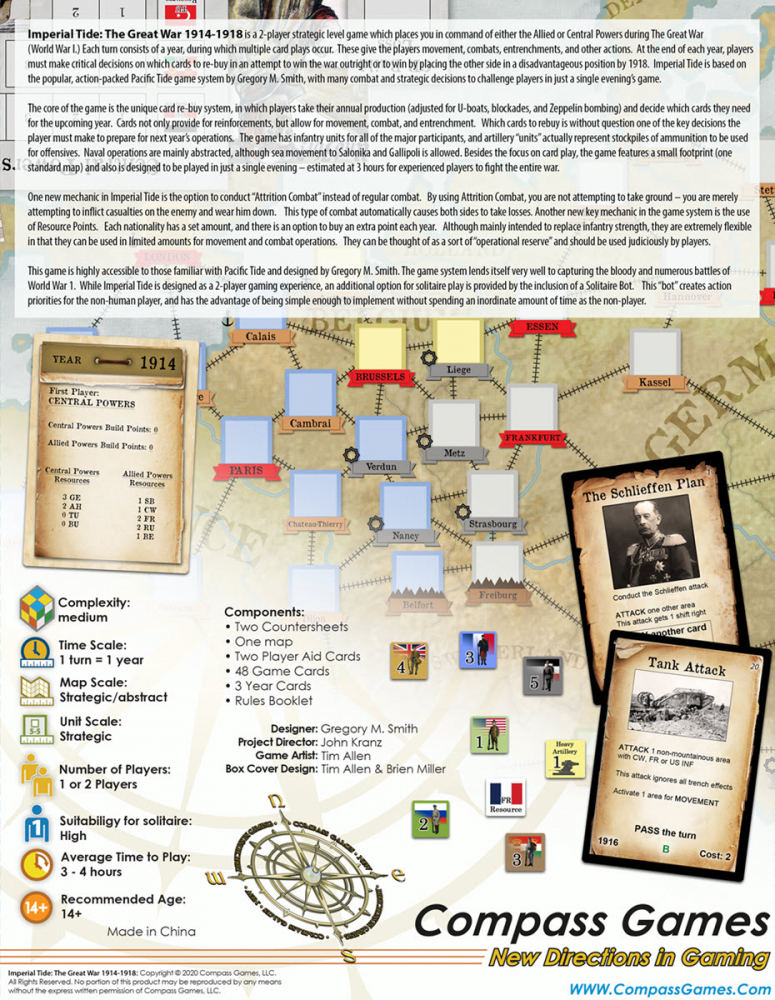 Imperial Tide: The Great War 1914-1918 is a 2-player strategic level game which places you in command of either the Allied or Central Powers during The Great War (World War I.) Each turn consists of a year, during which multiple cards plays occur. These give the players movement, combats, entrenchments, and other actions. At the end of each year, players must make critical decisions on which cards to re-buy in an attempt to win the war outright or to win by placing the other side in a disadvantageous position by 1918. Imperial Tide is based on the popular, action-packed Pacific Tide game system by Gregory M. Smith, with many combat and strategic decisions to challenge players in just a single evening’s game.