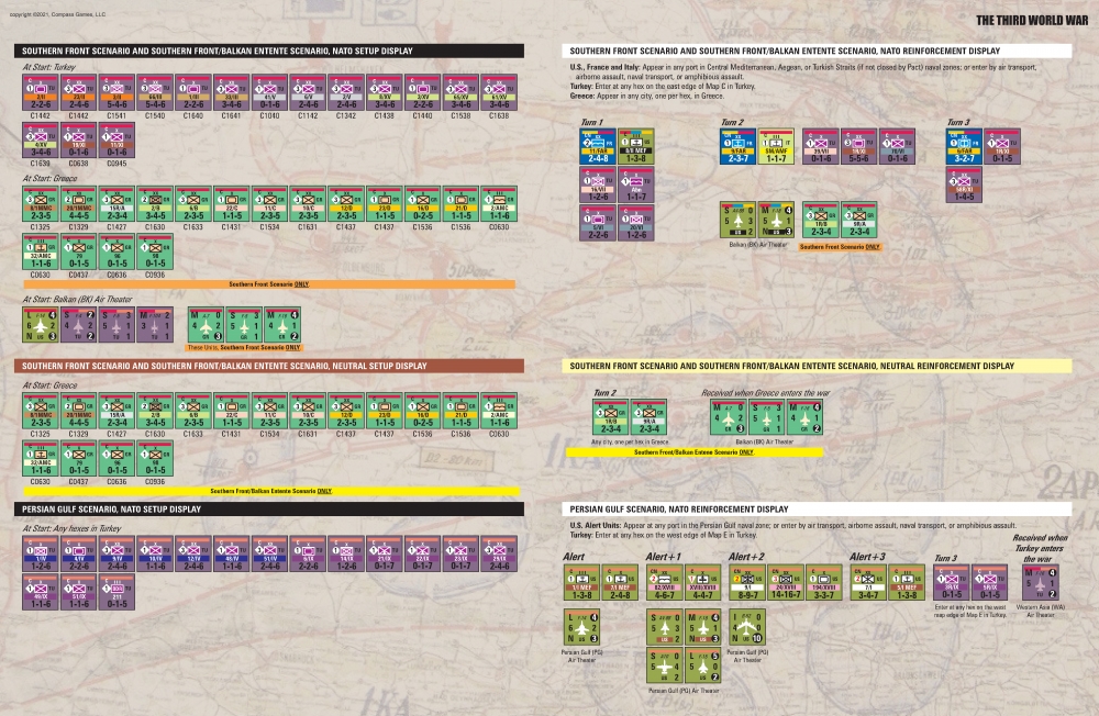 Southern Front: Race for the Turkish Straits adds Bulgaria and Romania, reinforced with three Soviet armies and special-capability forces, face Greece, Turkey, and Yugoslavia, thinly reinforced with a few elite units from the U.S., France, and Italy.