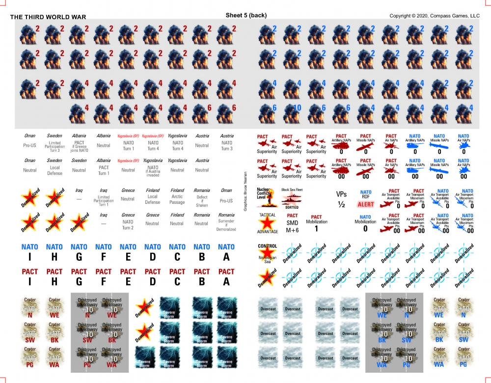 Player aid cards and associated markers, for tracking nuclear conflict level and nuclear attack points (NAPs), air transport points, and victory points