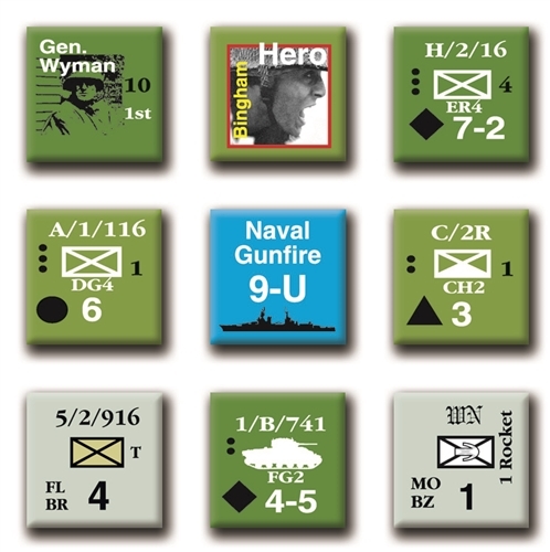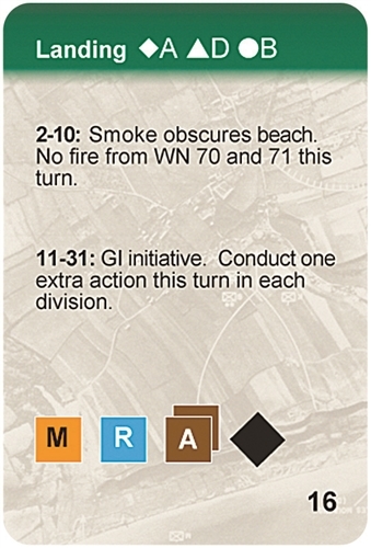 D-Day at Omaha Beach – covers the entire day, from 6:15 am to 6:00 pm. Optional rules explore what-ifs, such as more pre-invasion bombardment or the arrival of German armor.