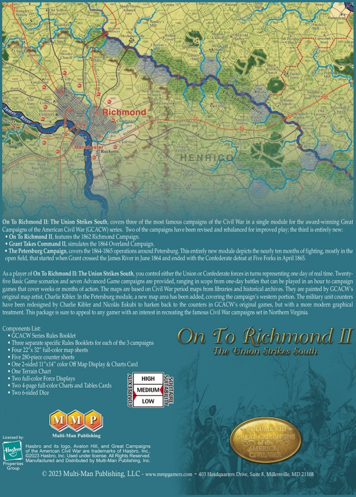 On to Richmond II: The Union Strikes South covers some of the most famous campaigns of the Civil War in a single module for the award-winning Great Campaigns of the American Civil War (GCACW) series. Two of the campaigns in this module have been revised, repackaged, and rebalanced for improved play; and the third is entirely new: