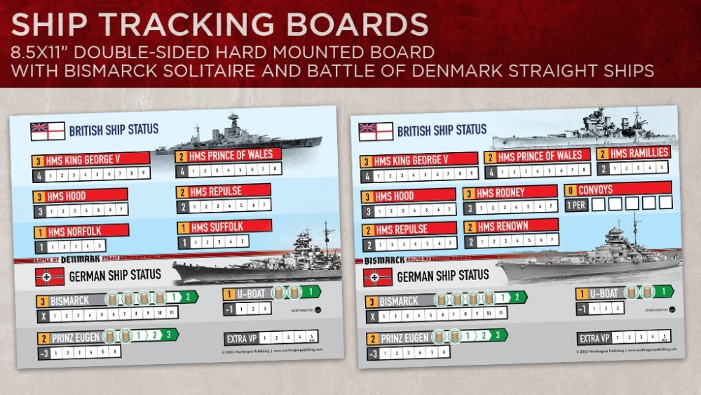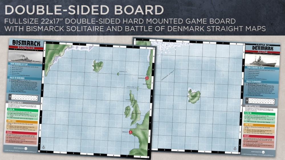 The game comes with a double sided game board with enhanced graphics. One side of the board is the North Atlantic at a strategic level with its convoys and all the British warships involved in protecting them from the Bismarck. The other side of the game board is of the Denmark Strait where the Bismarck needs to breakout into the Atlantic and British ships are there to stop them before the make the open seas.