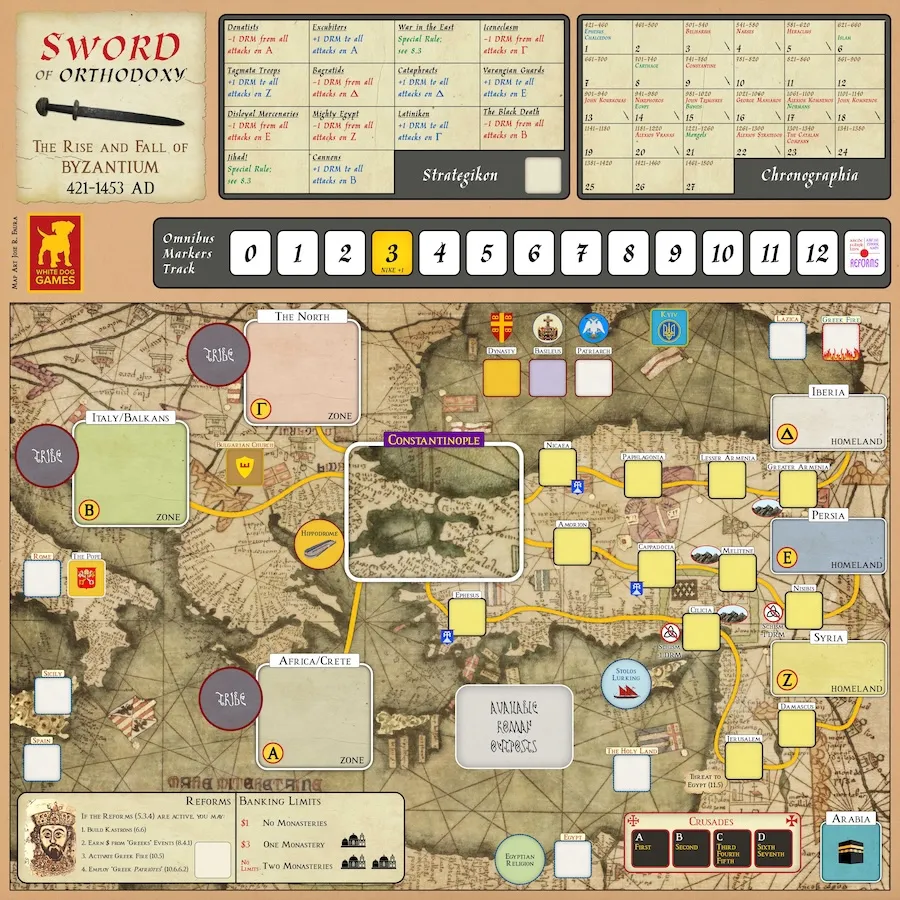 Sword of Orthodoxy is a strategic solitaire game of the rise and fall of the Byzantine Empire, simulating its saga from 421 AD until the end of the 15th century – an epic thousand year tale of heroism, betrayal, intrigue, and spectacular cultural achievements.